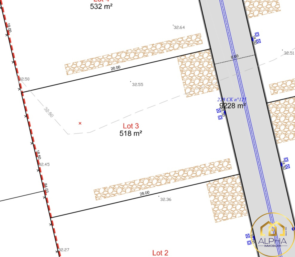 Alpha-Immobilier vous propose ce beau terrain d'une surface de 518 m², vendu viabilisé en eau, éléctricité, tout à l'égout, et libre de constructeur.